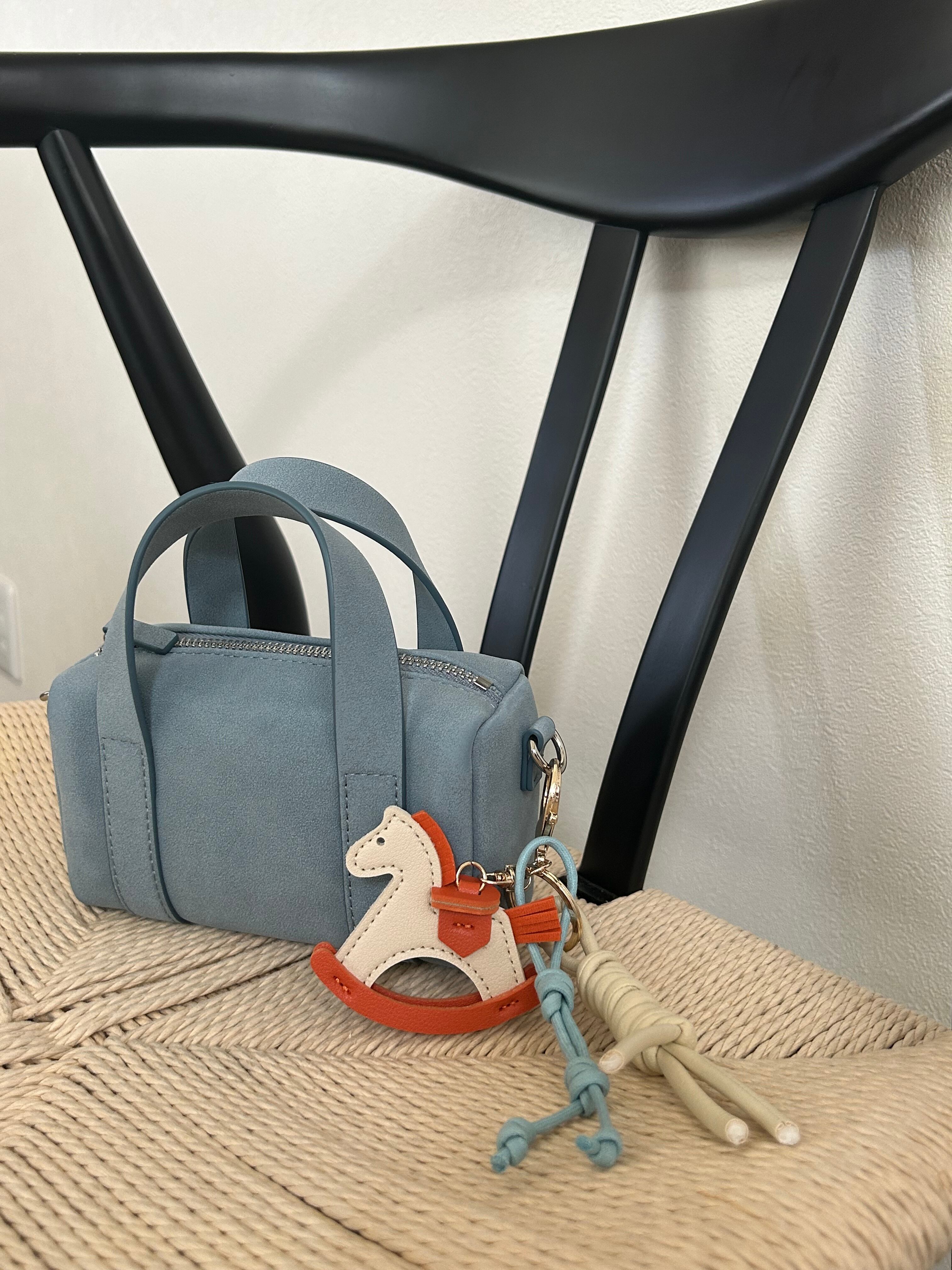馬モチーフのチャームにブルーのレザーが涼しげなバッグチャームです。シンプルながら洗練されたデザインで、どんなスタイルにもぴったりフィットし、日常使いに最適なアイテムです。