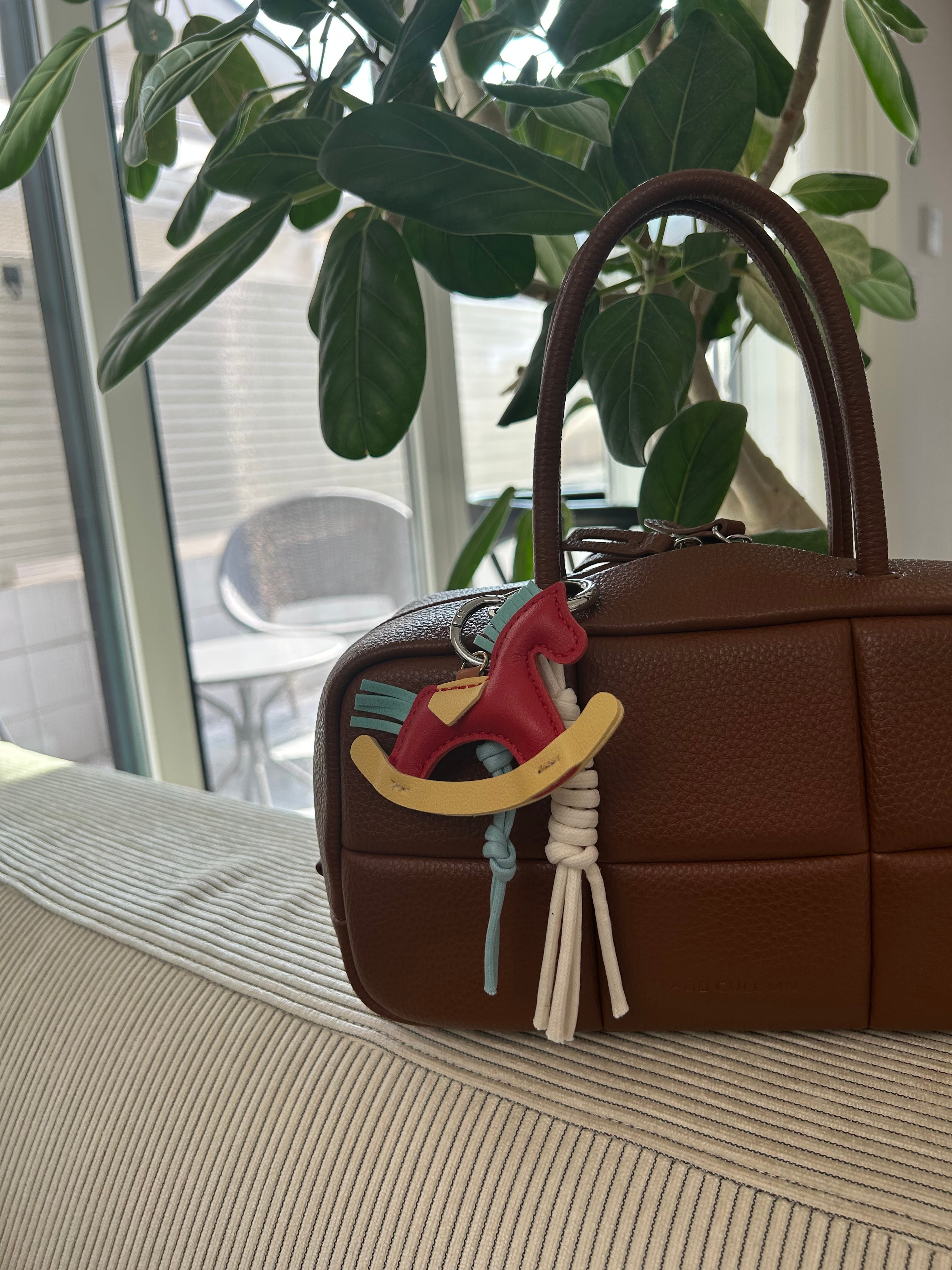バッグチャームです。鮮やかなレッドと爽やかな水色のコンビネーションが特長で、どんなスタイルにもマッチし、日常使いに最適です。