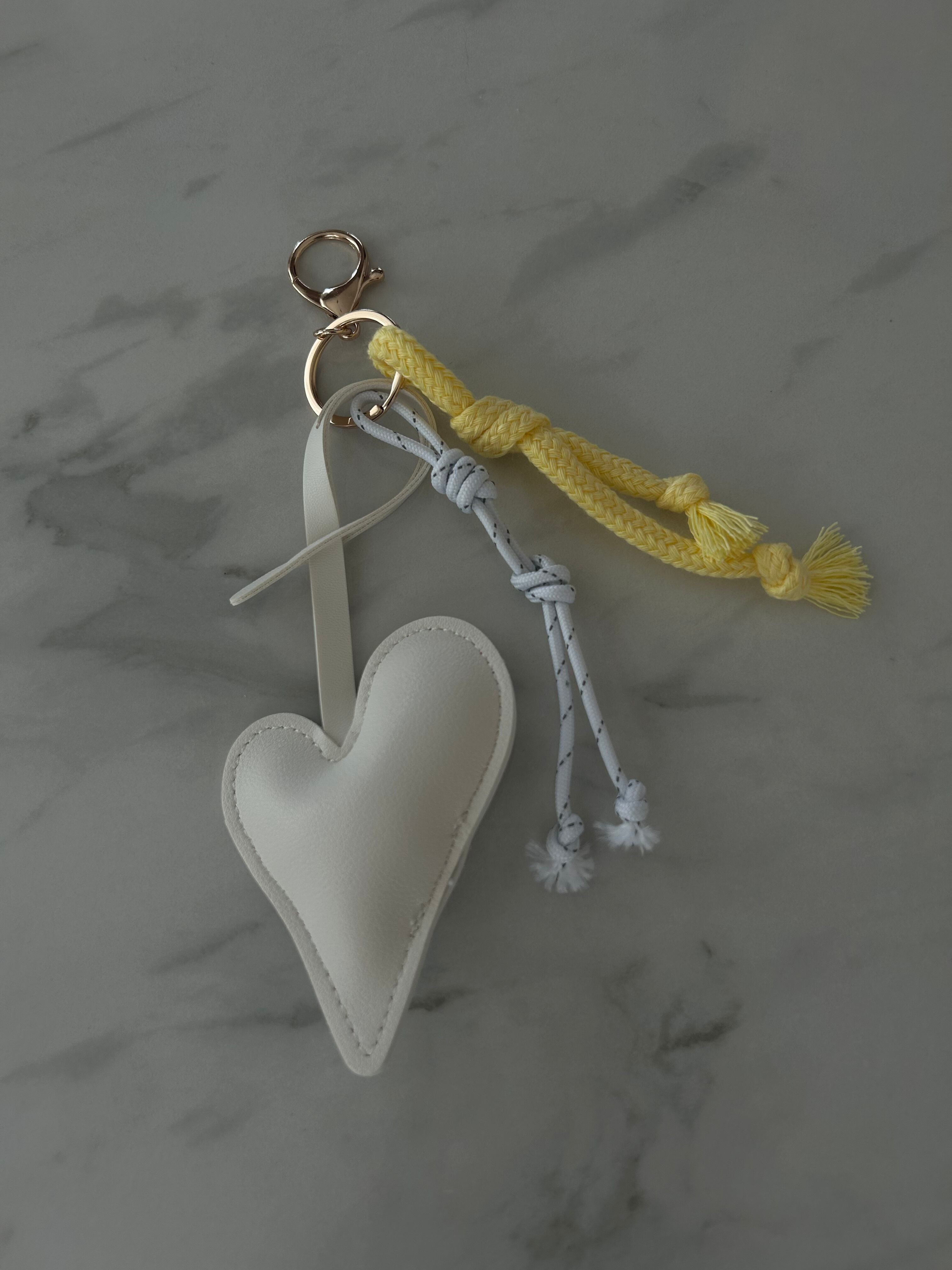 ホワイトハートのレザーチャームです。可愛らしさの中にカジュアルな紐素材を組み合わせることで