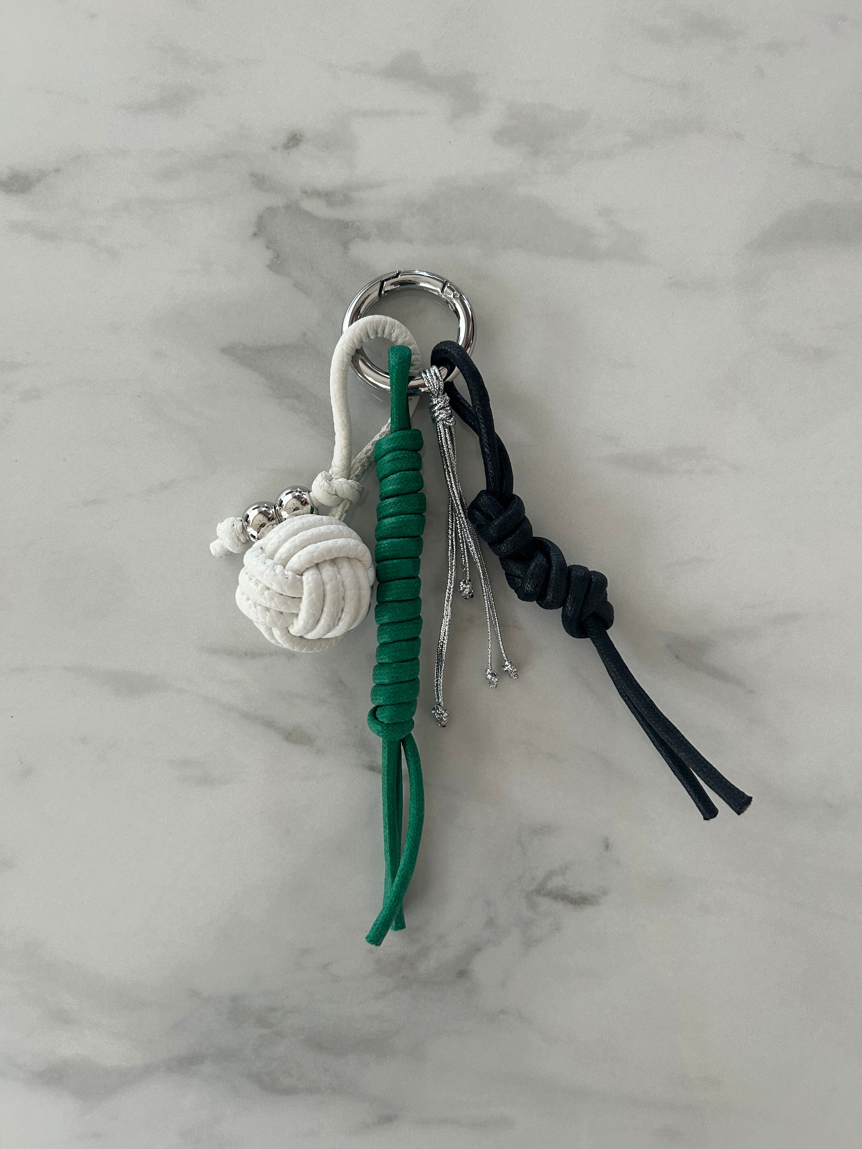 ホワイト、ブラック、グリーンの3色からなるバッグチャームです。シンプルながらも洗練されたデザインが特長で、どんなスタイルにもマッチし、日常使いに最適です。